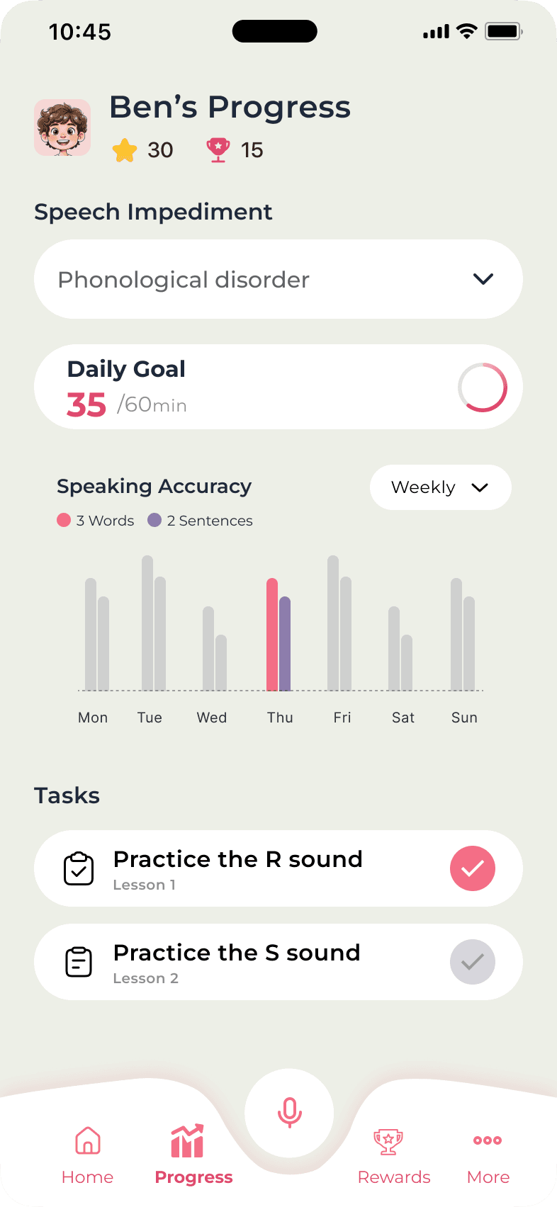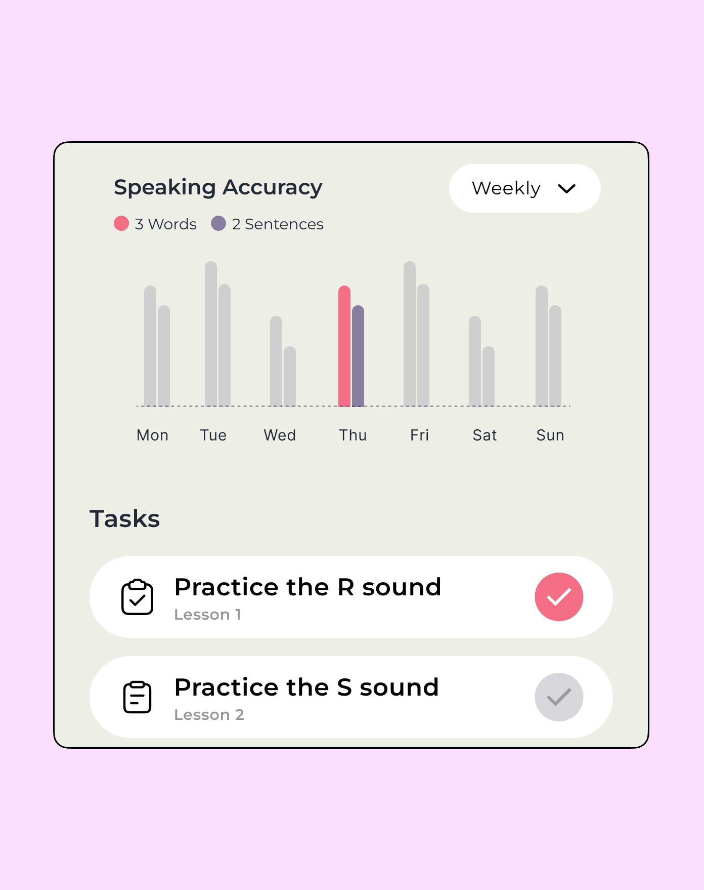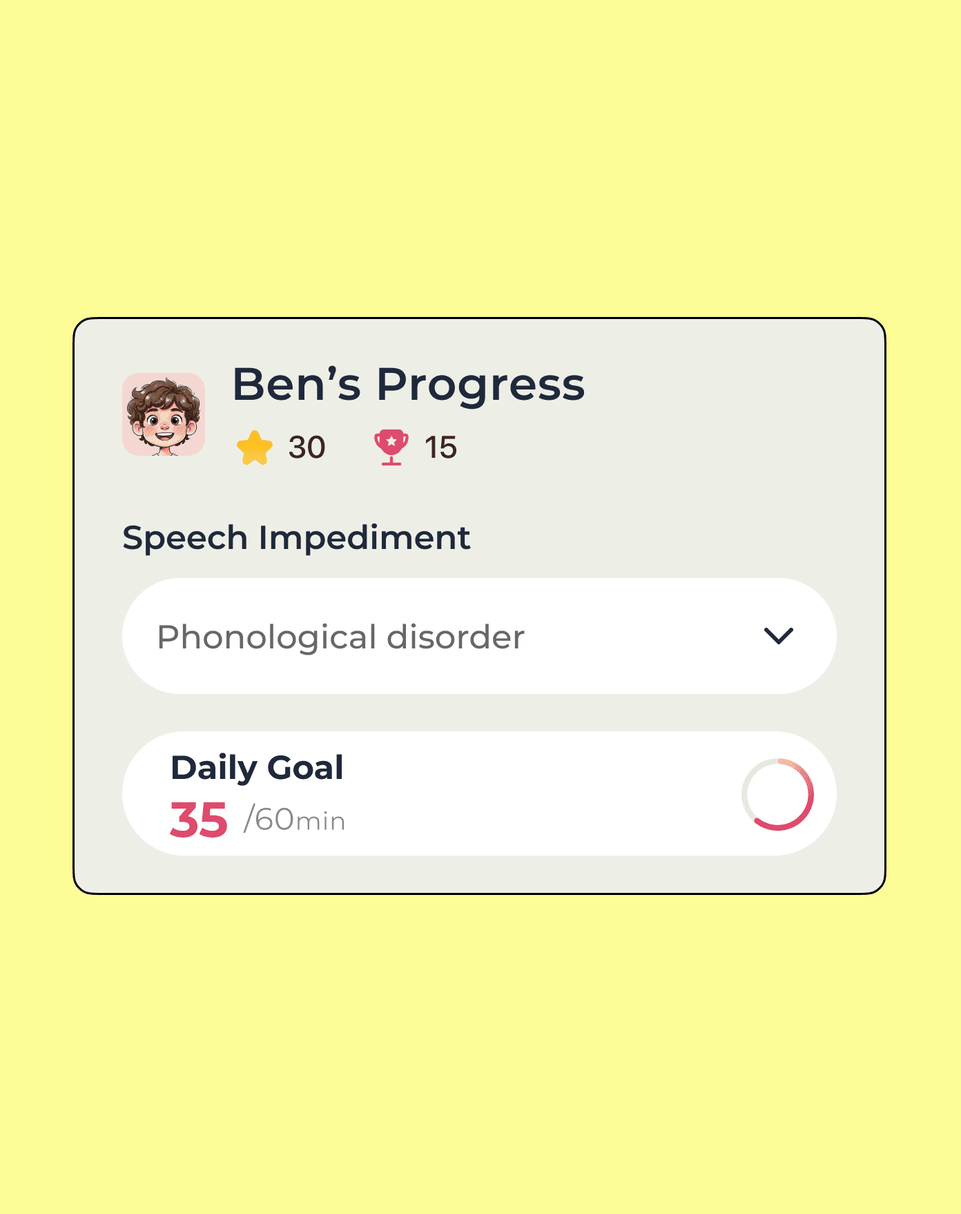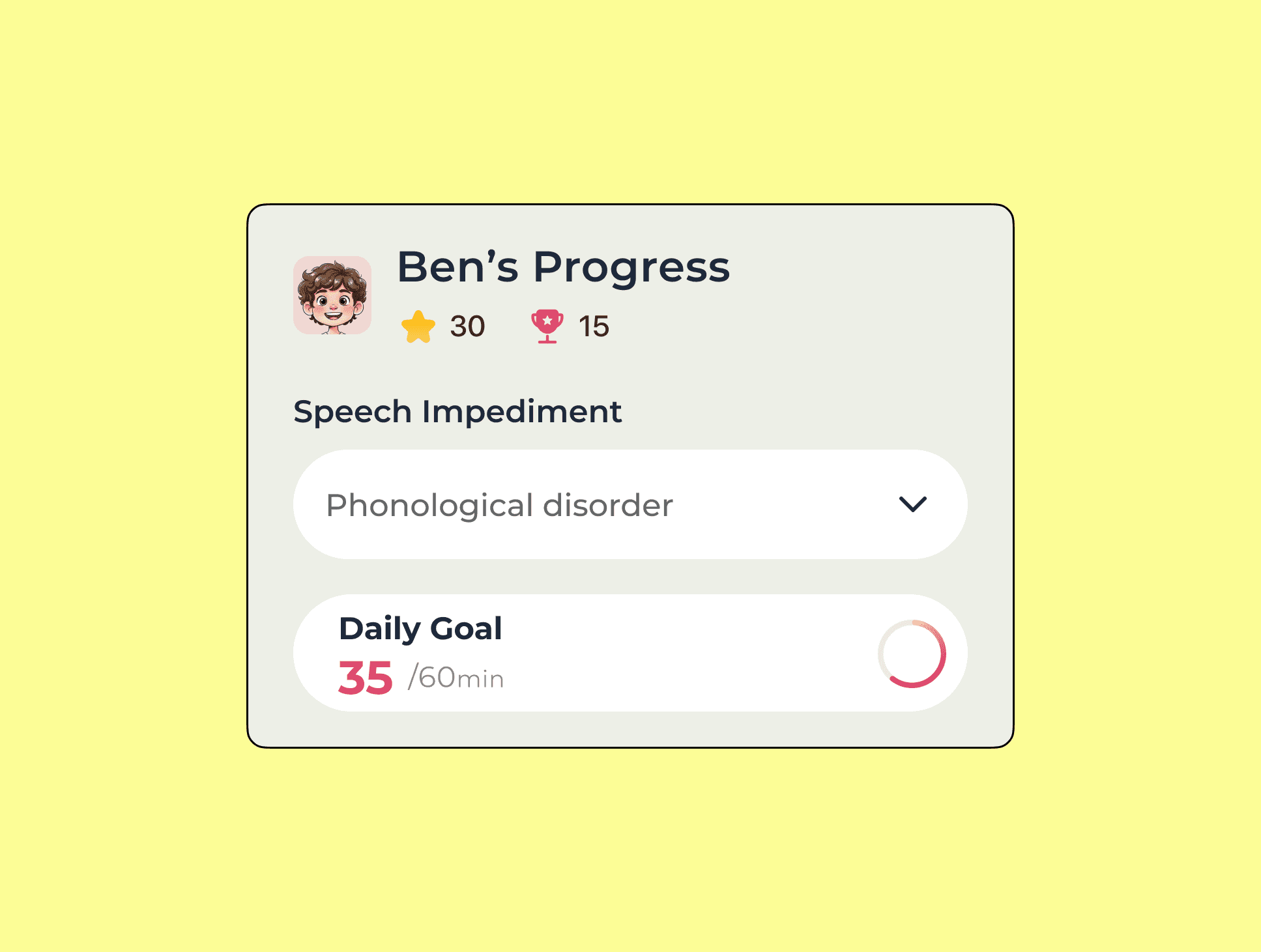 Select speech impediments such as phonological disorders, general language impairments and speech delay or let Animora detect them. Set simple daily goals to help your child build consistent practice habits.
