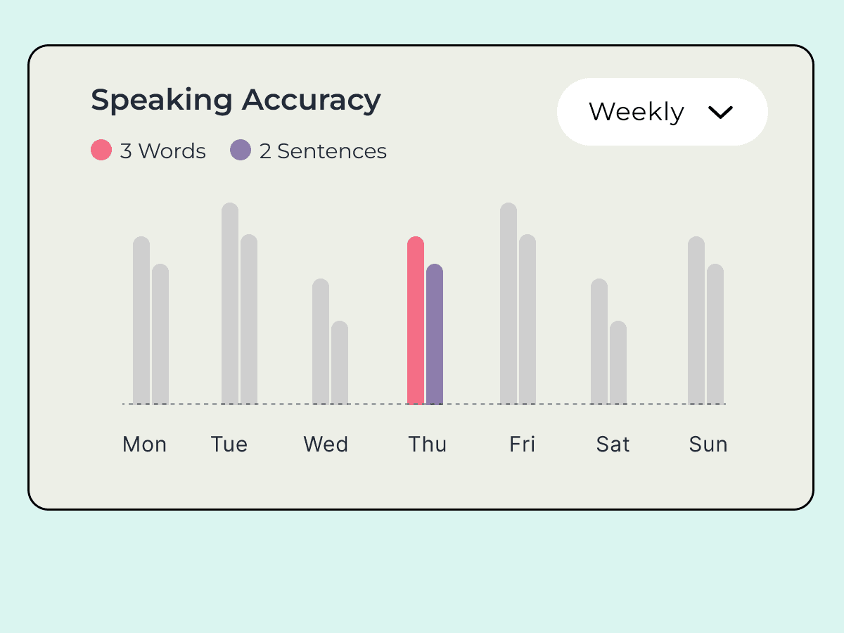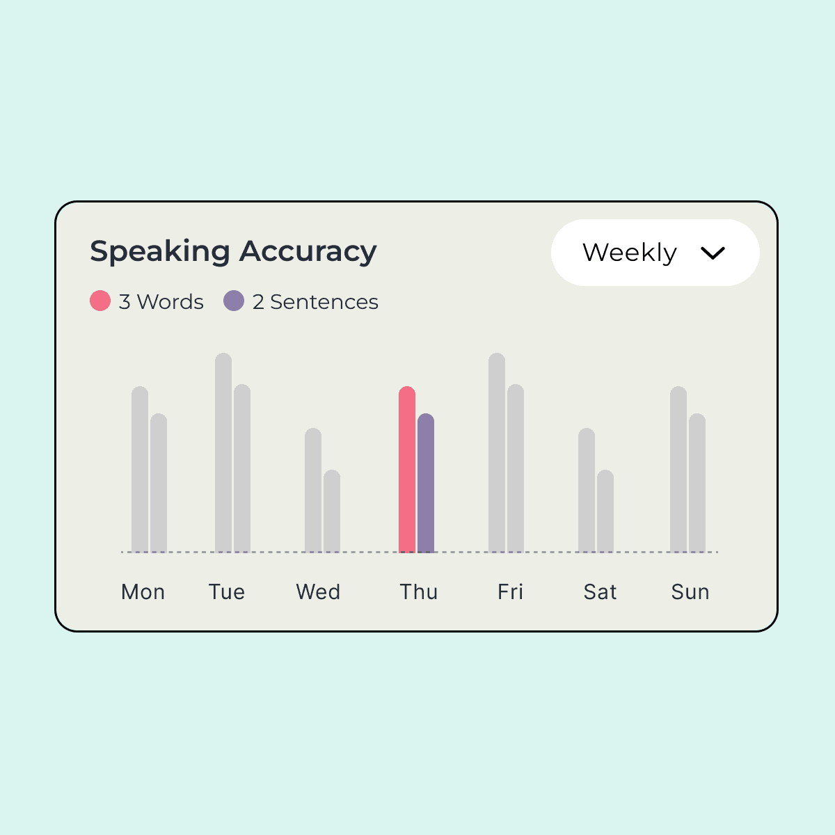 Simple visuals show improvements in correct words, accuracy, streaks and weekly trends — so you always know what’s working.
